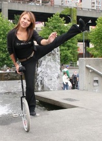Kaori Matsuzawa has been riding unicycles for 13 years with unmatched grace. She was a competitor and a unicycle coach in her native Japan, and is now a full-time student at a California university. Kaori has won world championships in individual free style and pairs freestyle, and has been runner-up in group freestyle. She was also featured on Dan Heaton's "Defect" DVD. Kaori occasionally teaches unicycling in different countries and states.