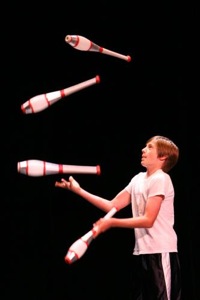 Noah Malone is 14 years old and has been juggling for nearly three years; moving quickly from basics with a set of gift beanbags to practicing two hours a day. Noah won a five ball best trick competition medal in 2009, and came in second place at the World Juggling Federation 2007 training camp.